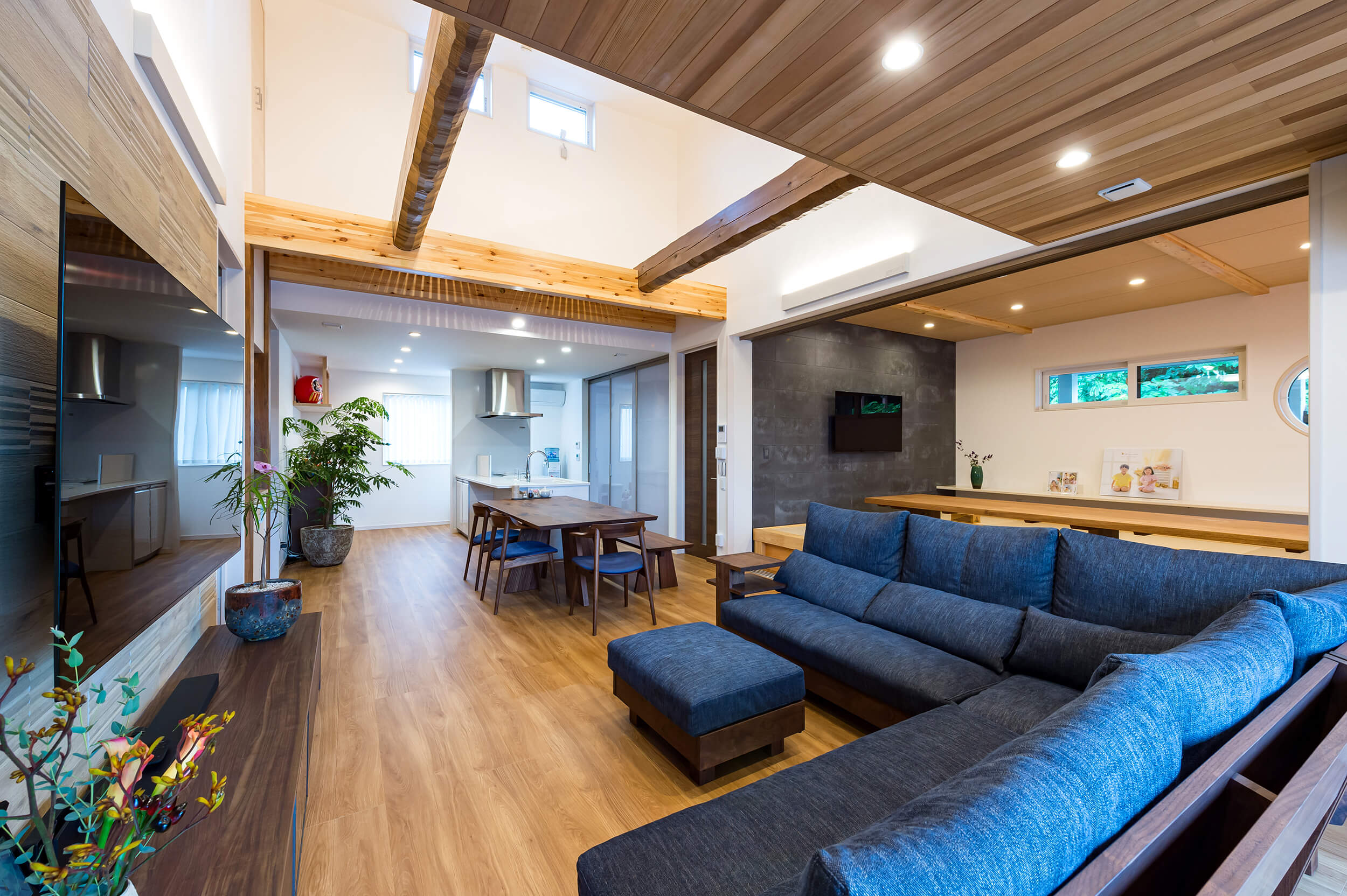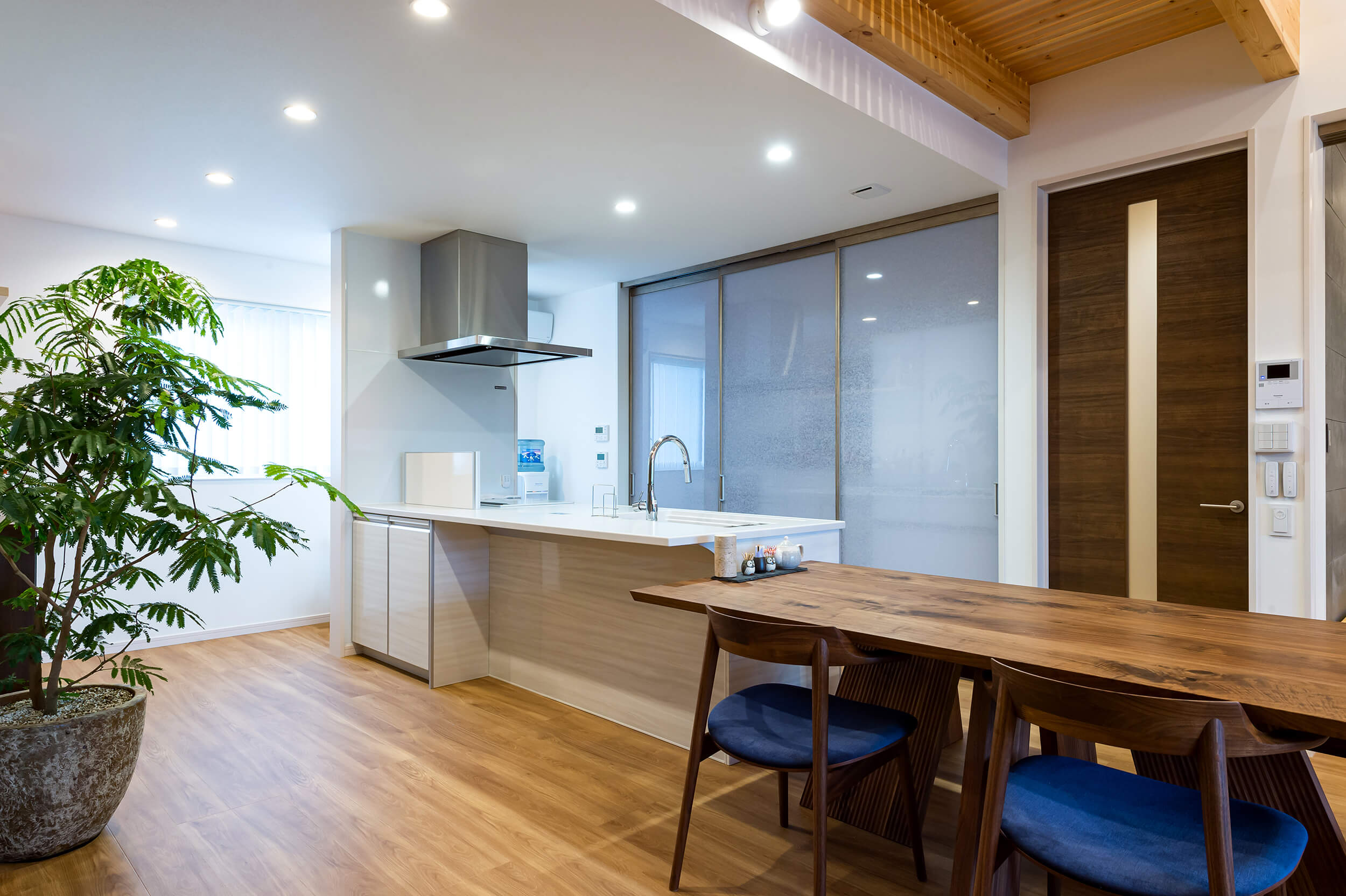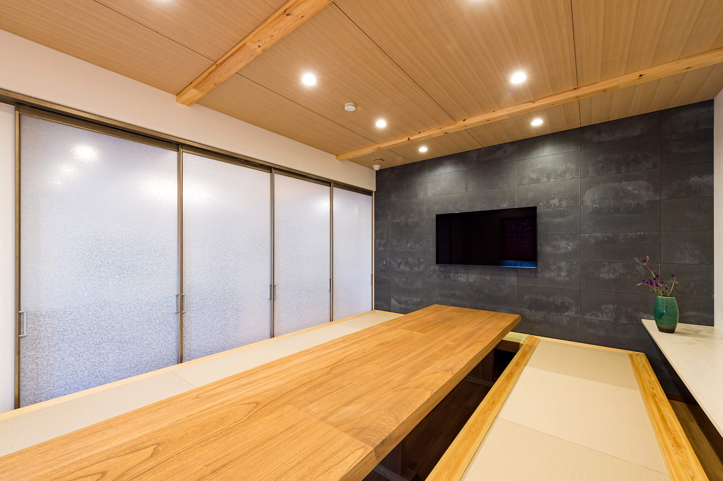 ご家族が特にこだわったのが「宴会のできる畳ダイニング」です。小上がりと掘り炬燵に仕上げており、冬でも寒さを感じないよう床暖房も完備しています。素材も、木目が美しい桐材のテーブルに、石壁をイメージしたメインウォールは外壁材ソリド。親戚や友人たちを数多く招待して、皆で楽しく、賑やかにお酒を酌み交わす―そんなワンシーンが目に浮かぶようです。