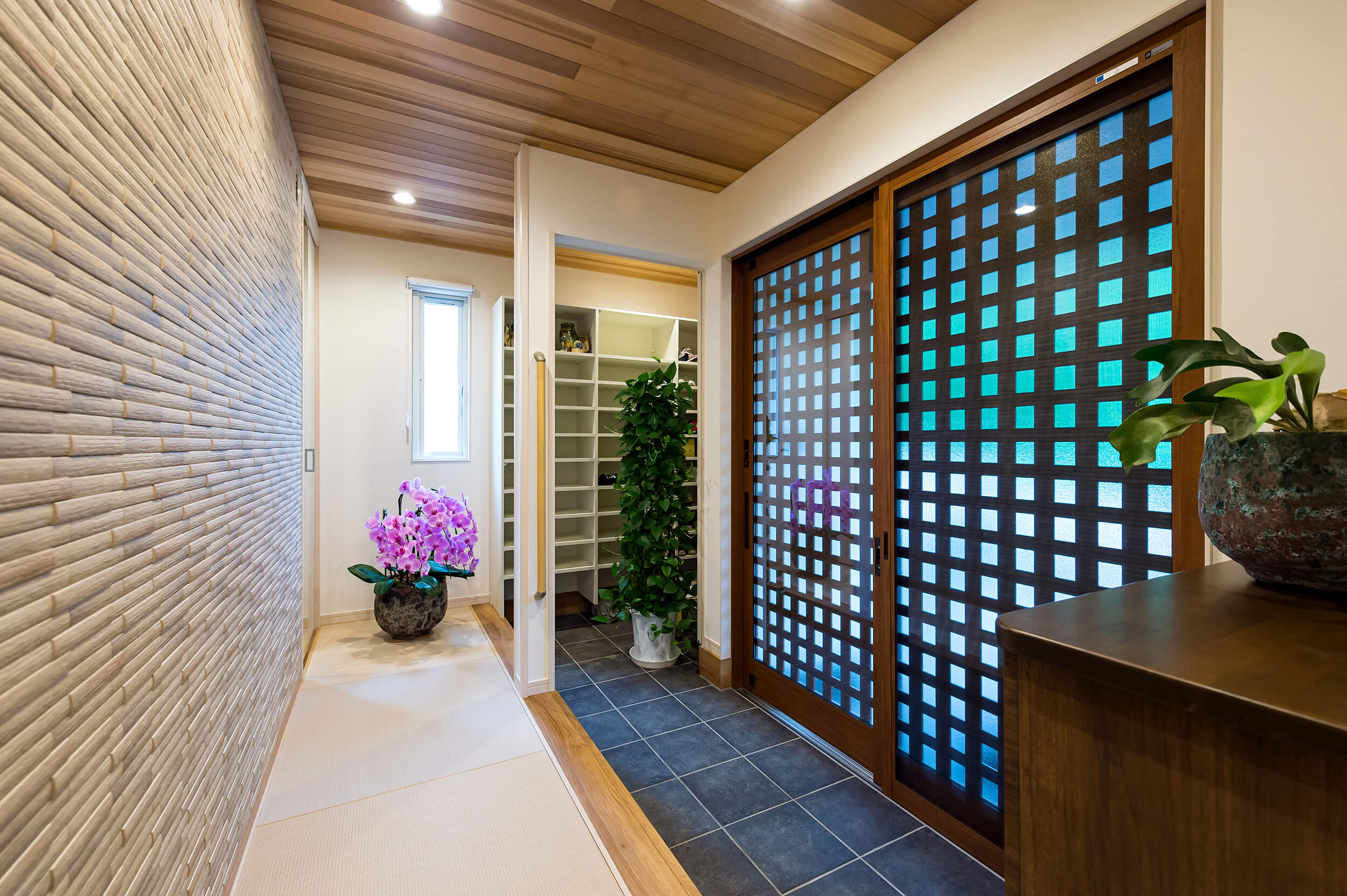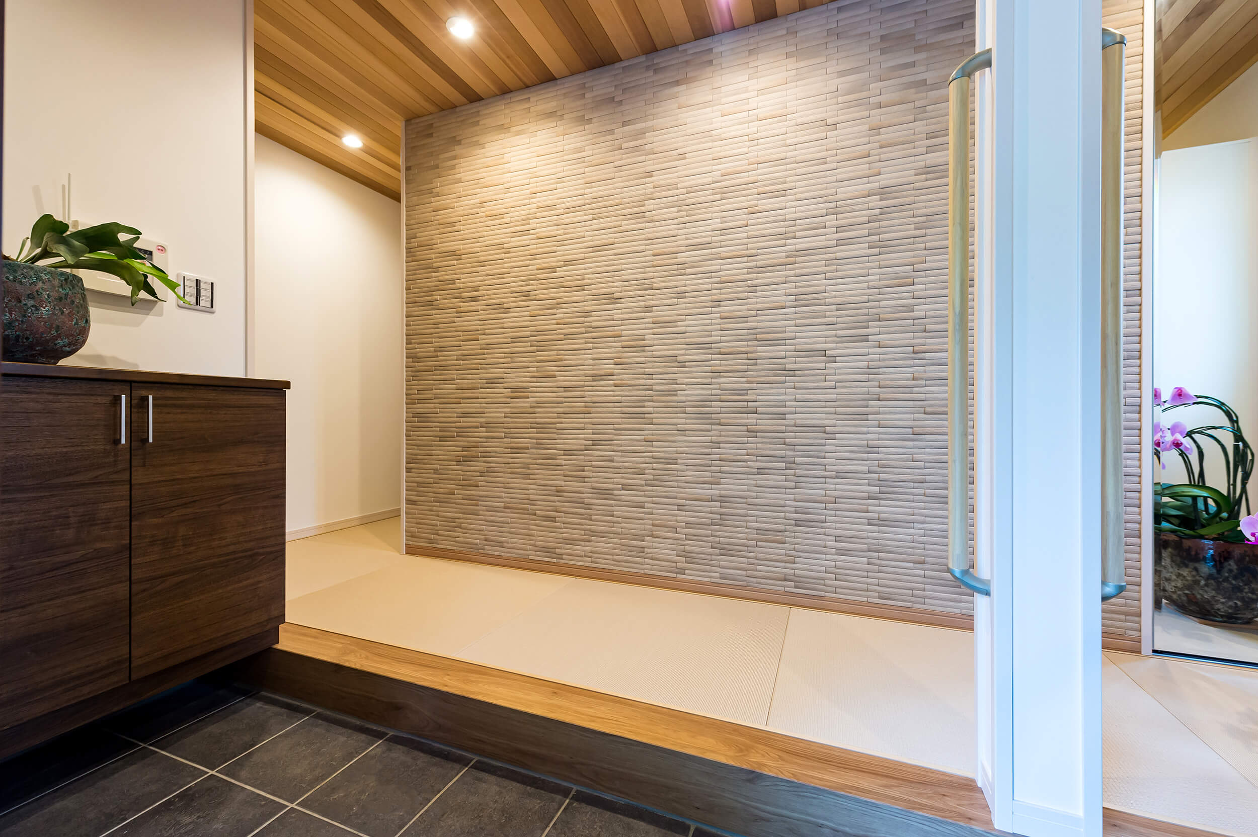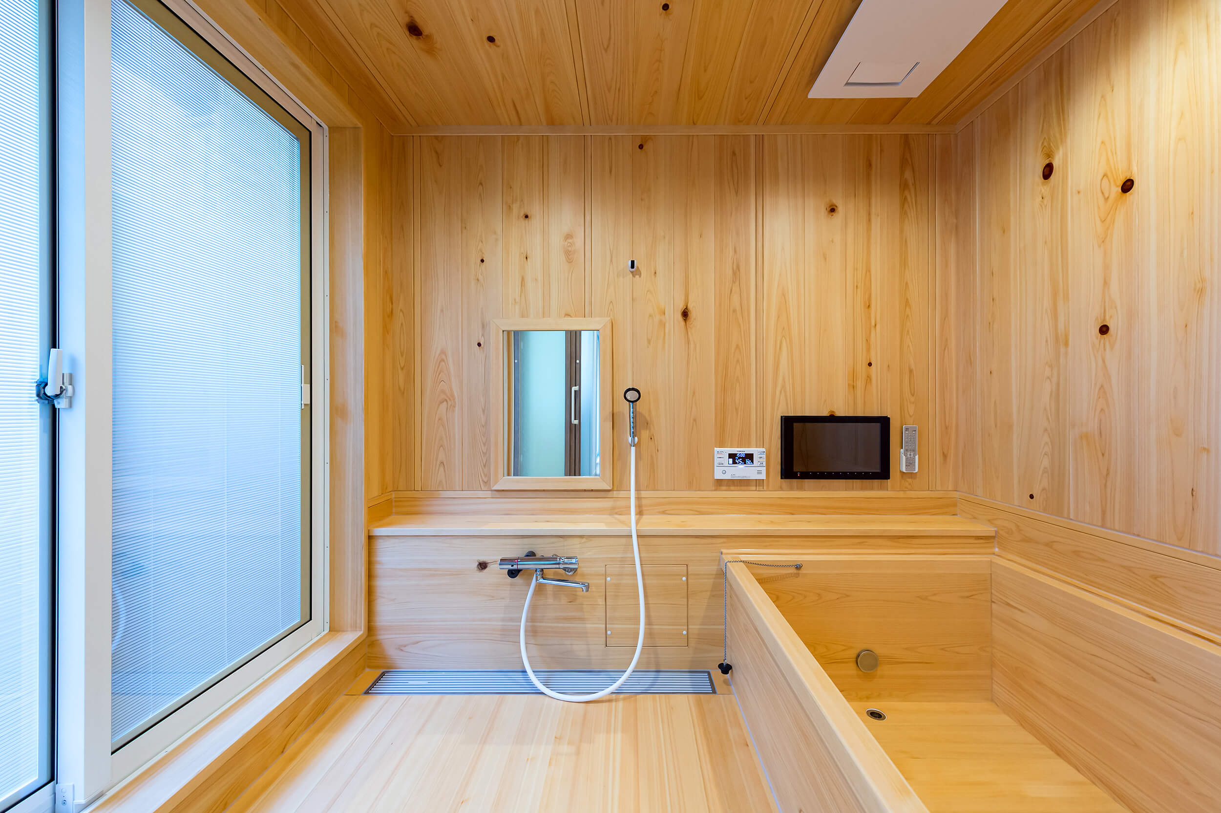 また、もう一つの強いご要望が、ご主人の長年の夢だった「檜風呂」。一日を締めくくる、最高のリラックスタイムとなるでしょう。奥から女将が姿を現しそうな畳敷きの玄関ホールも含めて、まるで温泉旅館のよう。