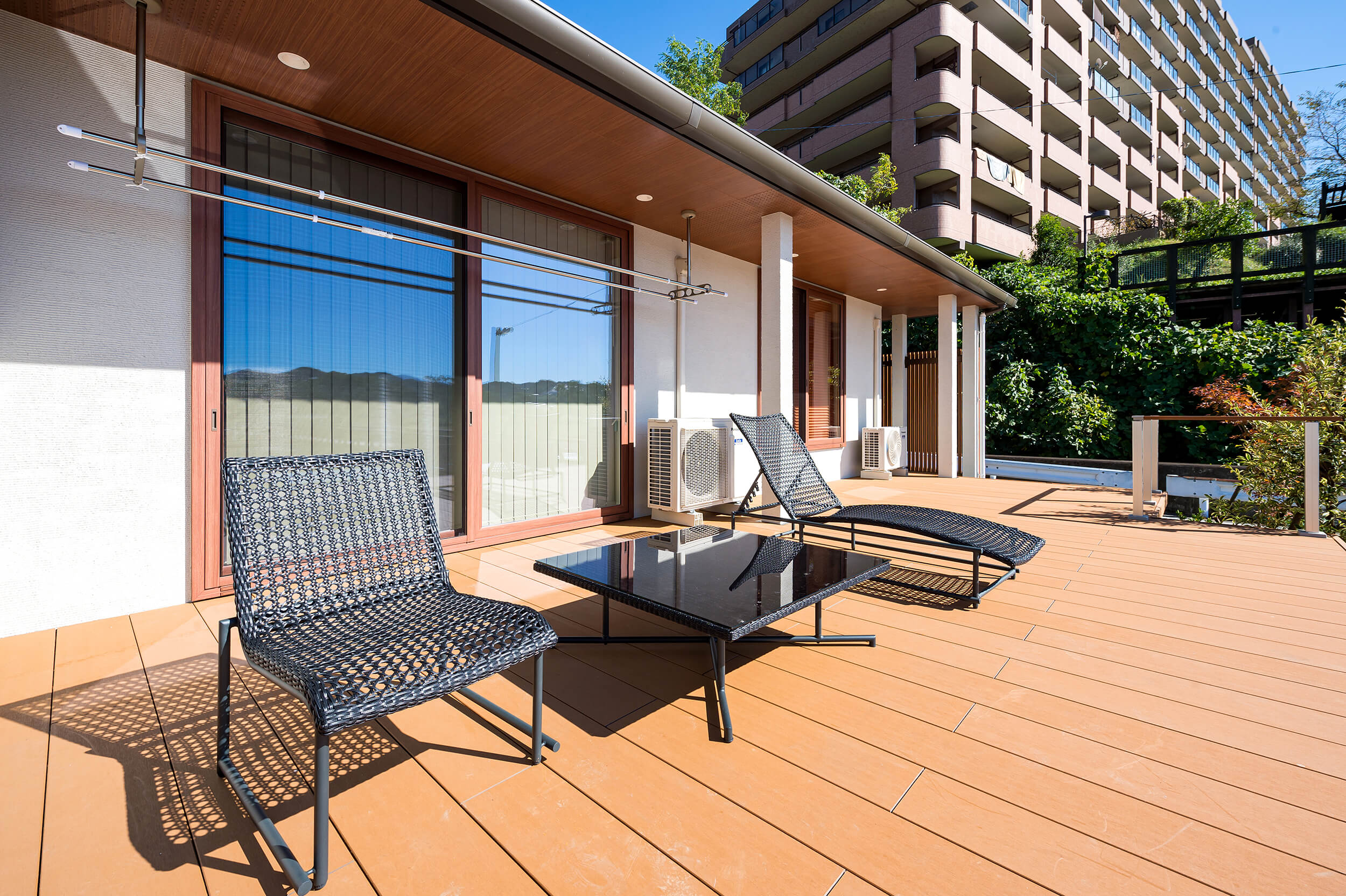 敷地に対して可能な限り東西に長く建物をゾーニングした外観では、広々としたウッドデッキを実現。バーベキューや日向ぼっこにぴったりのスペースです。
