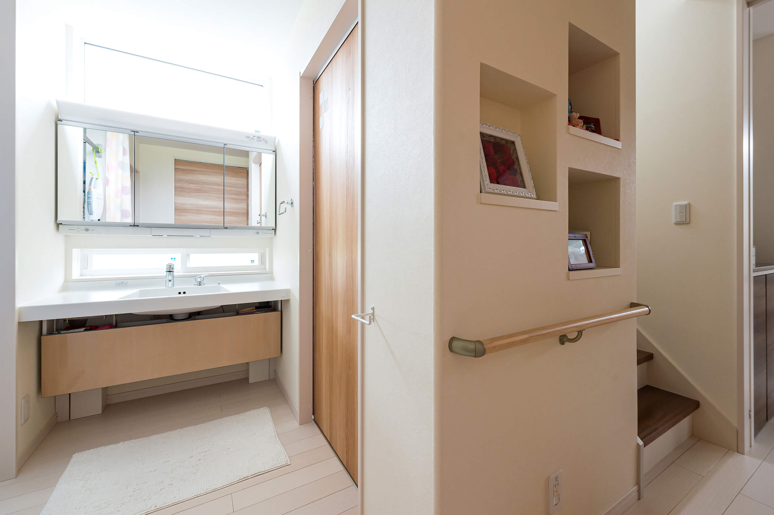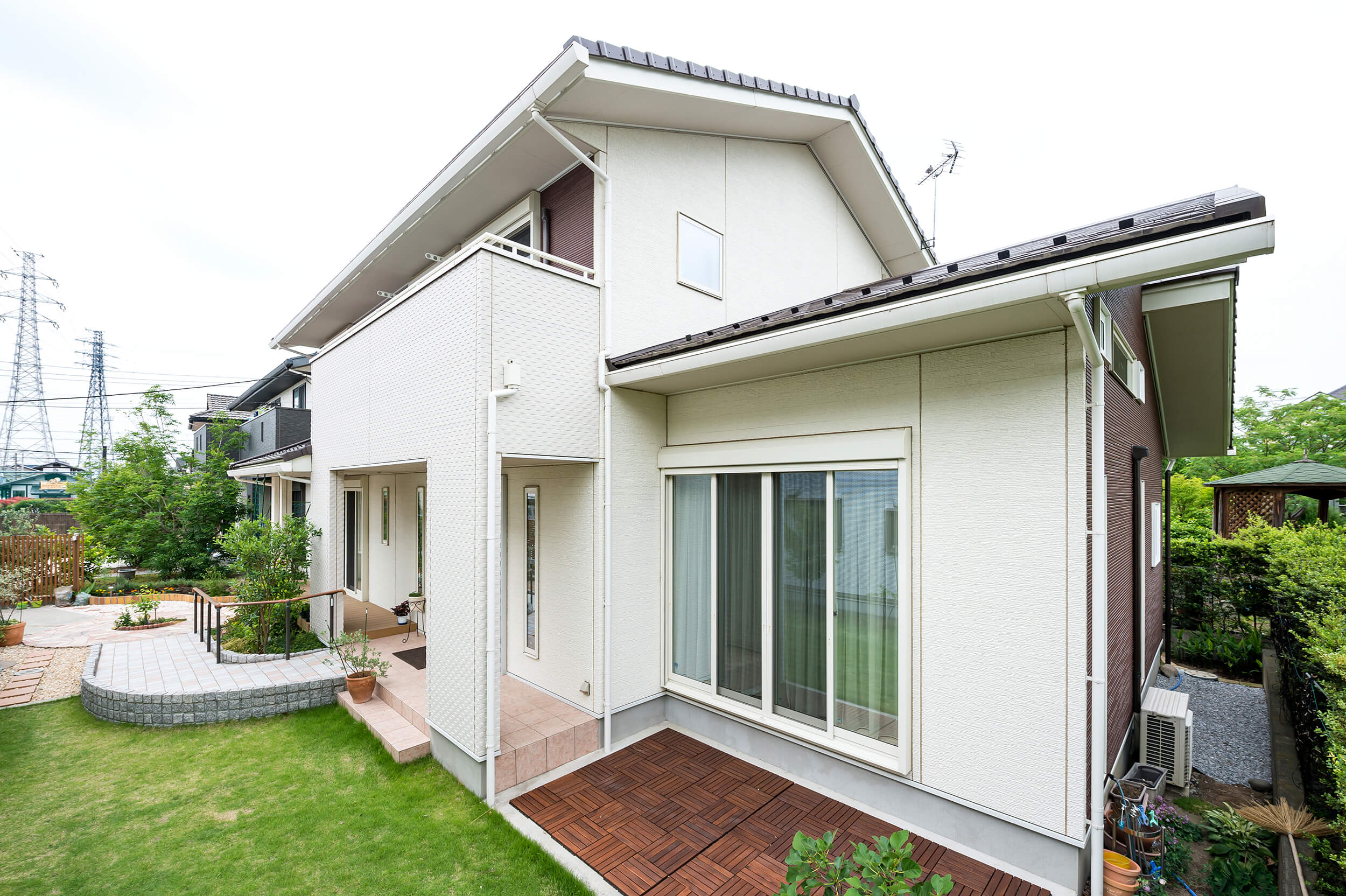 淡い色彩のタイル、車椅子でも行き来できる緩やかなアプローチ。「大好きな草花に囲まれて暮らしたい」というご家族の夢を叶えた外観とエクステリア。