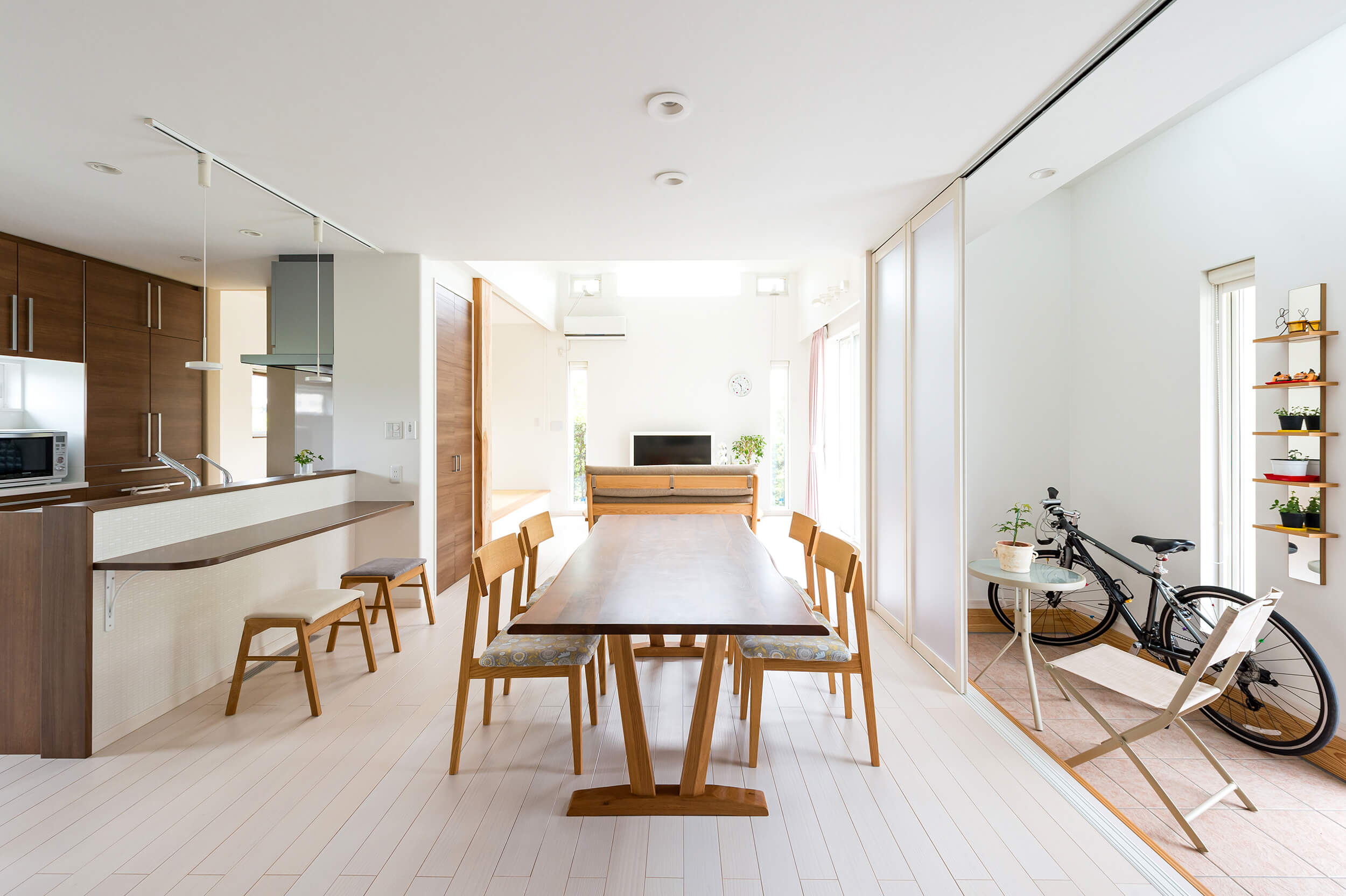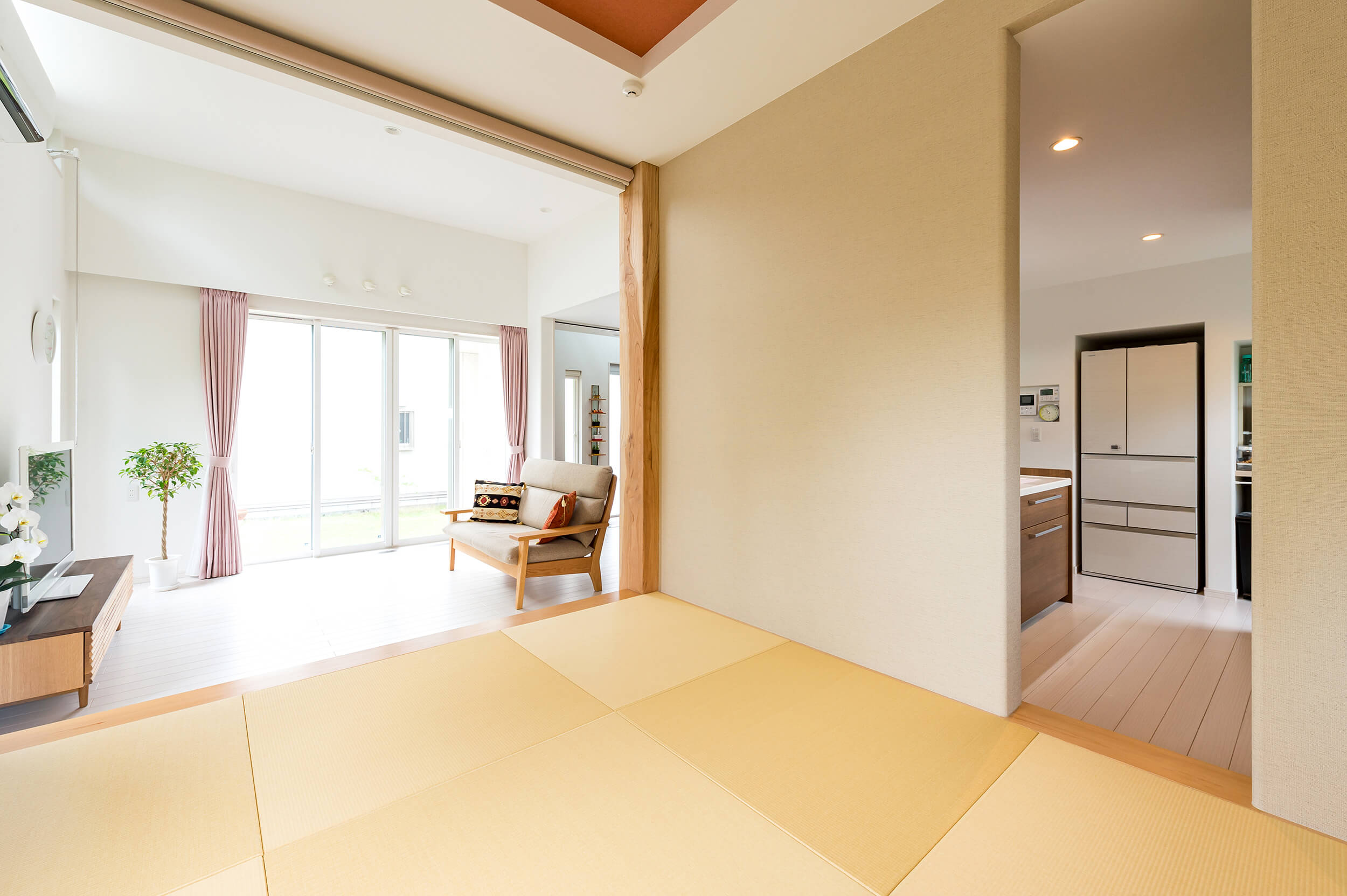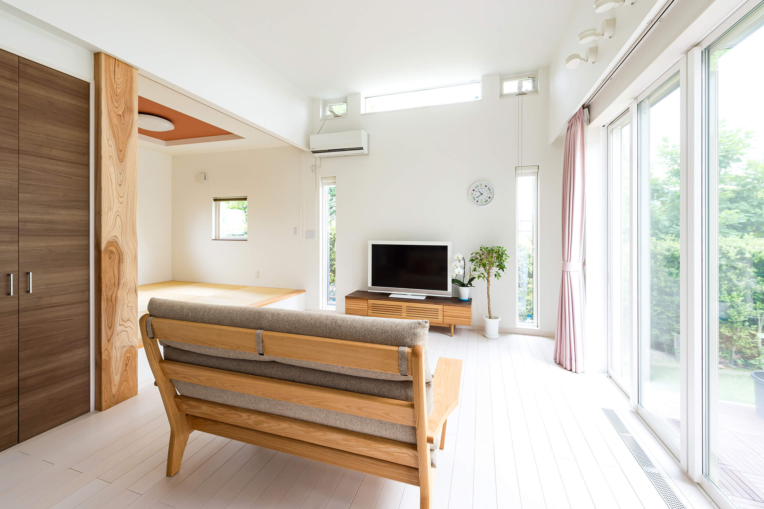 リビングの大黒柱はケヤキ。白をベースに、インテリアで木の質感をプラスしたり、窓の先に広がる豊かな緑を「借景」として楽しむことも。また、キッチンから直接アクセス可能な小上がりの畳コーナーは、冬は炬燵を出してご家族で鍋を囲むことを見据えるなど、たくさんのアイデアが詰まったお住まいです。