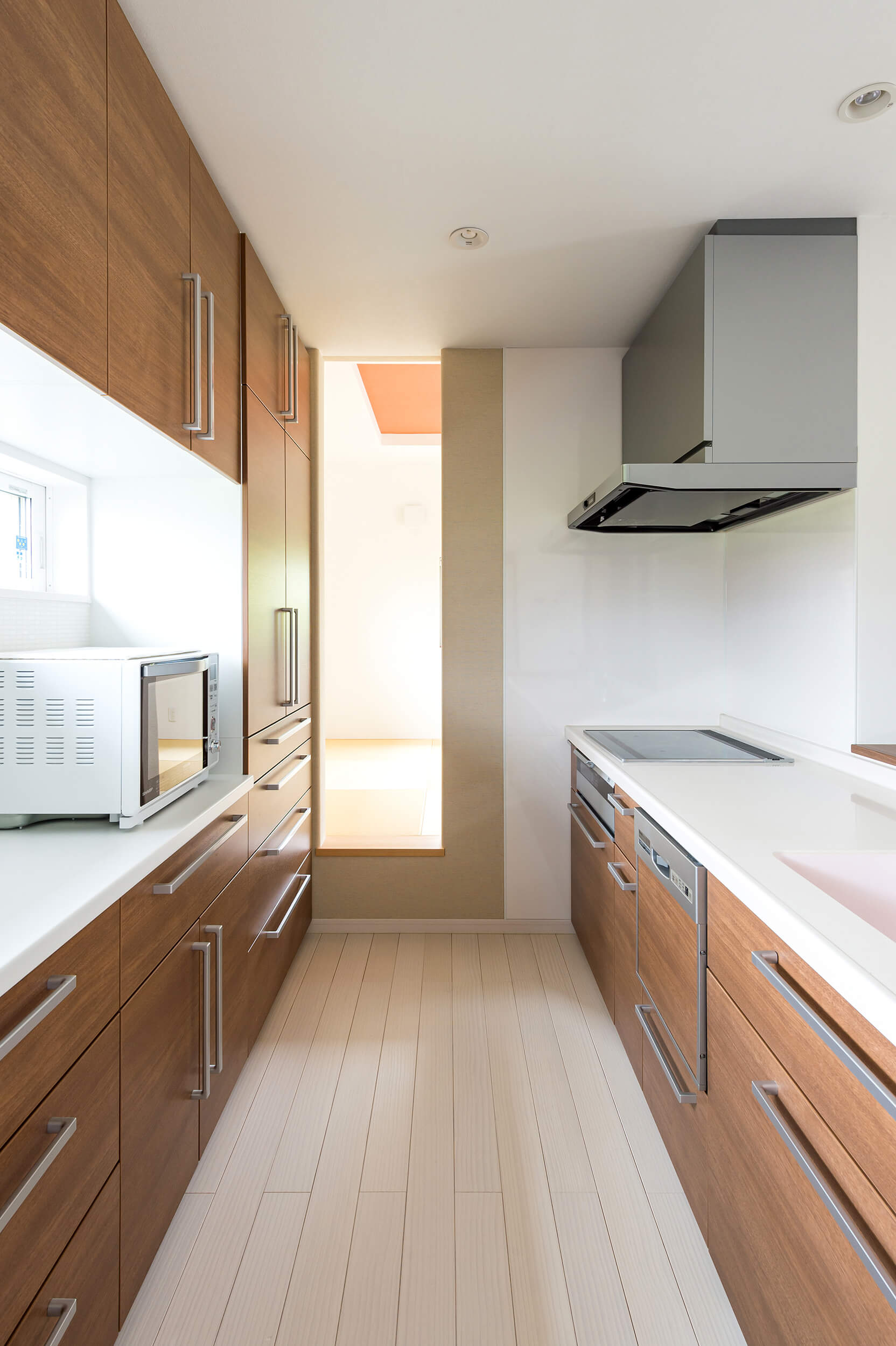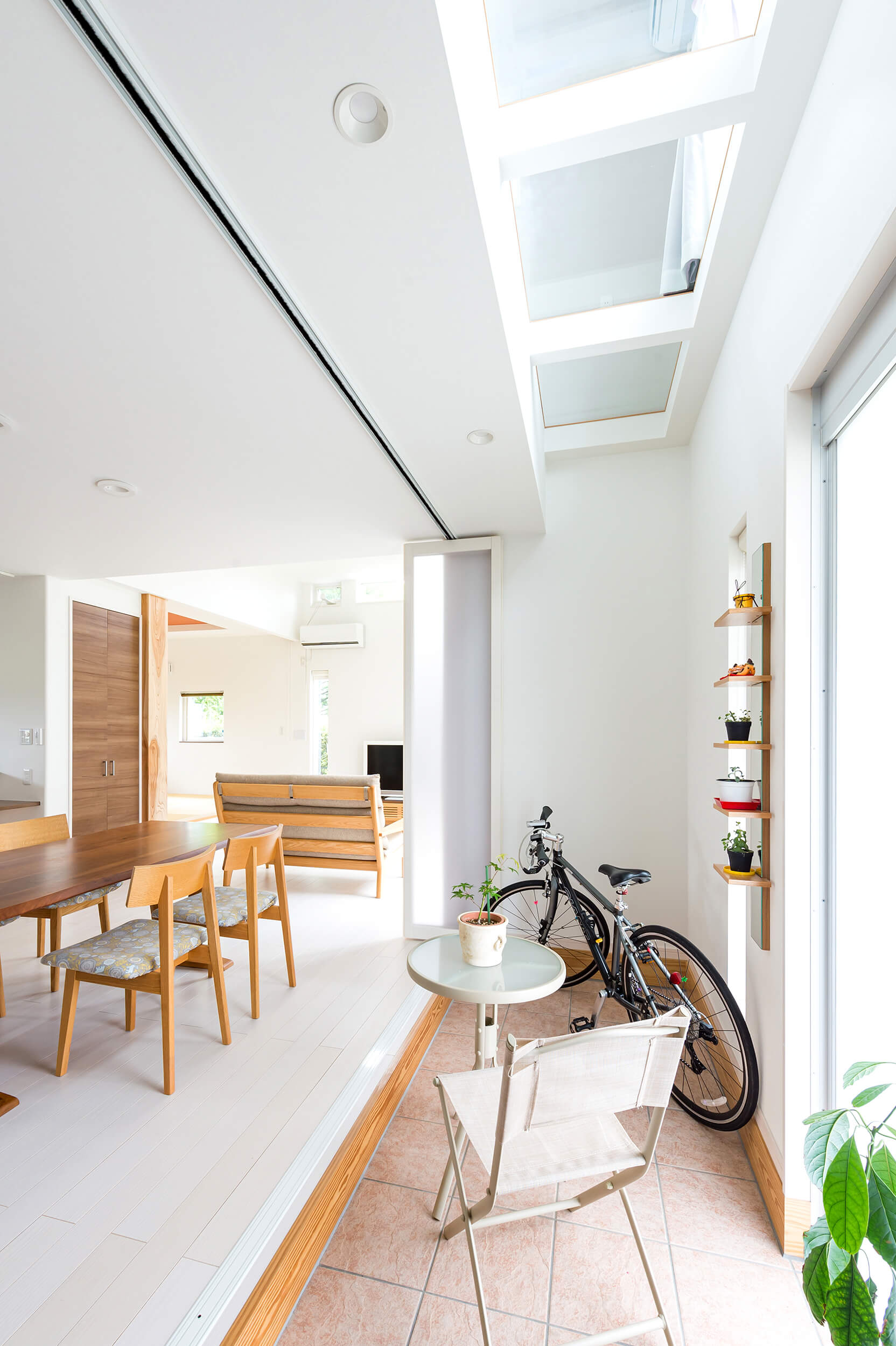 工夫を凝らしたLDKと一体型の玄関土間は、予算やサイズの問題から吹き抜けは諦めても、充分な採光と開放感を得るため、2階の居室と繋がる天井に強化ガラスを採用。さらにLDKとの仕切りは、オフィスや結婚式場で使われるスライディングウォール。自在に開け閉めできるほか、アクリルパネルのため窮屈感もありません。