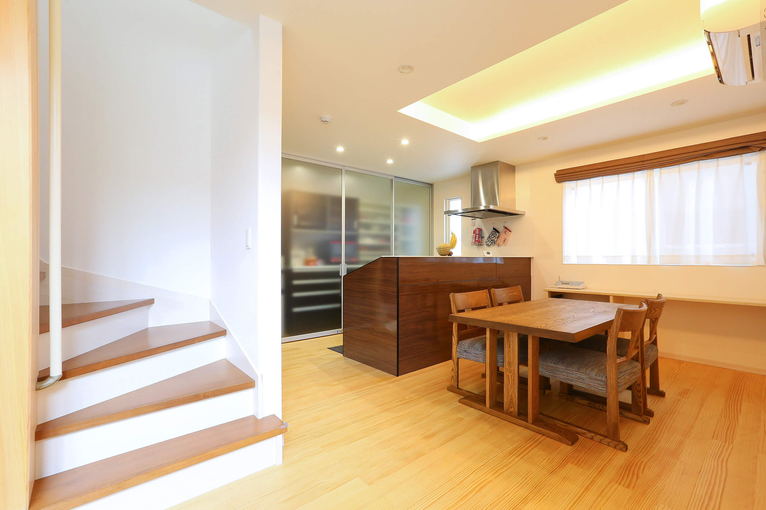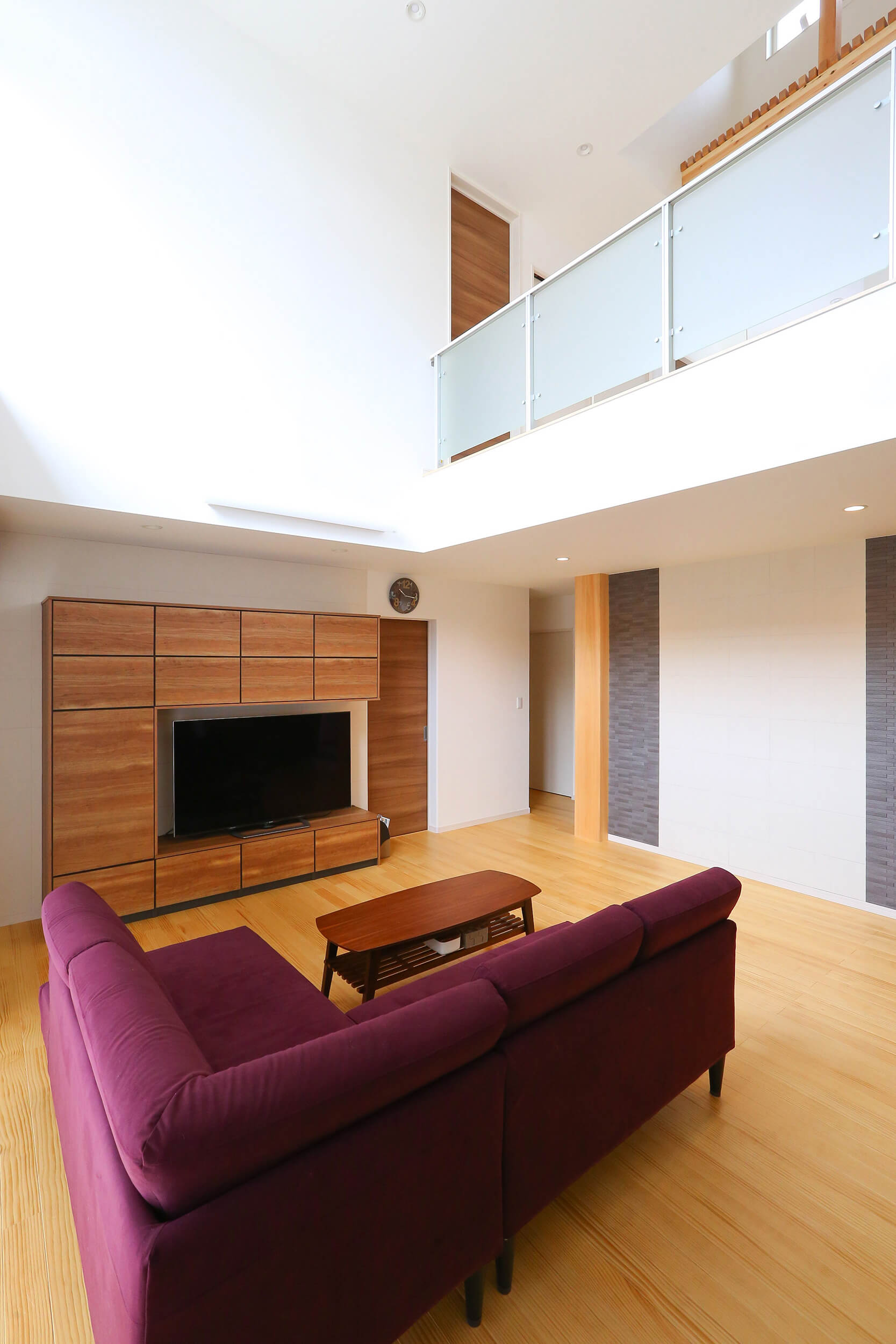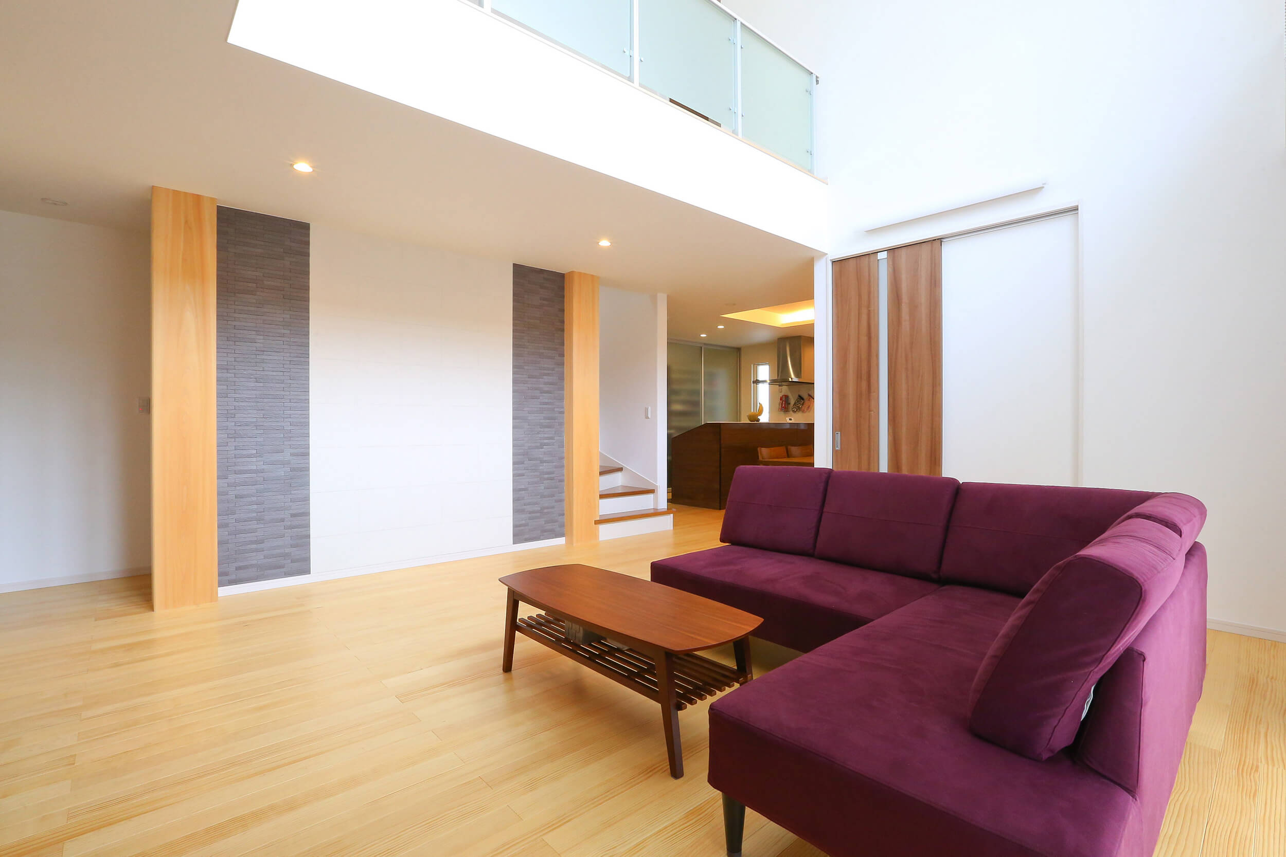 対照的に邸内は木の温もりをイメージしたフローリングをはじめ、清々しい空気感が味わえる漆喰の塗り壁や豪壮な檜の大黒柱が印象的なナチュラル・スタイル。ご主人が憧れた吹き抜けも、各空間を繋ぎ、住まいの一体感を演出するなど、どこにいても家族の気配を感じることができるでしょう。